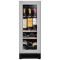 This model is equipped with a triple-glazed grey door made of UV-resistant tempered glass, with a stainless steel door frame. White LED interior lighting with switch enhances bottle visibility and cellar design.